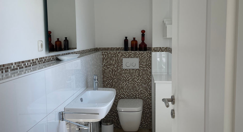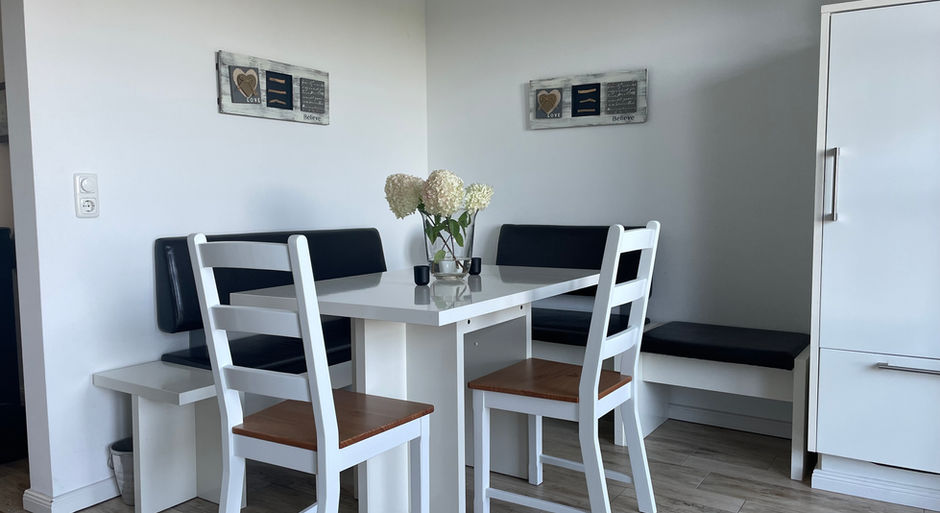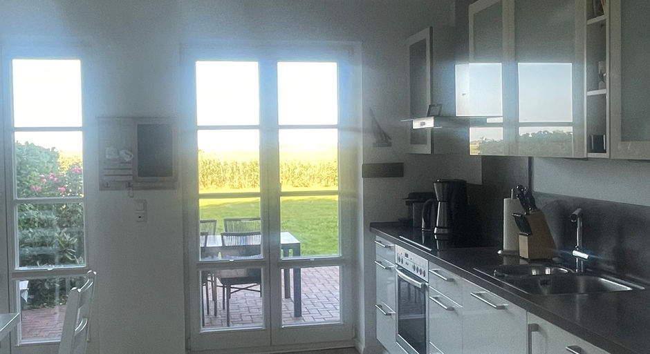 Große Ess- Küche mit Geschirrspüler, Kühlschrank mit Gefrierfach, Backofen und Kaffeemaschine